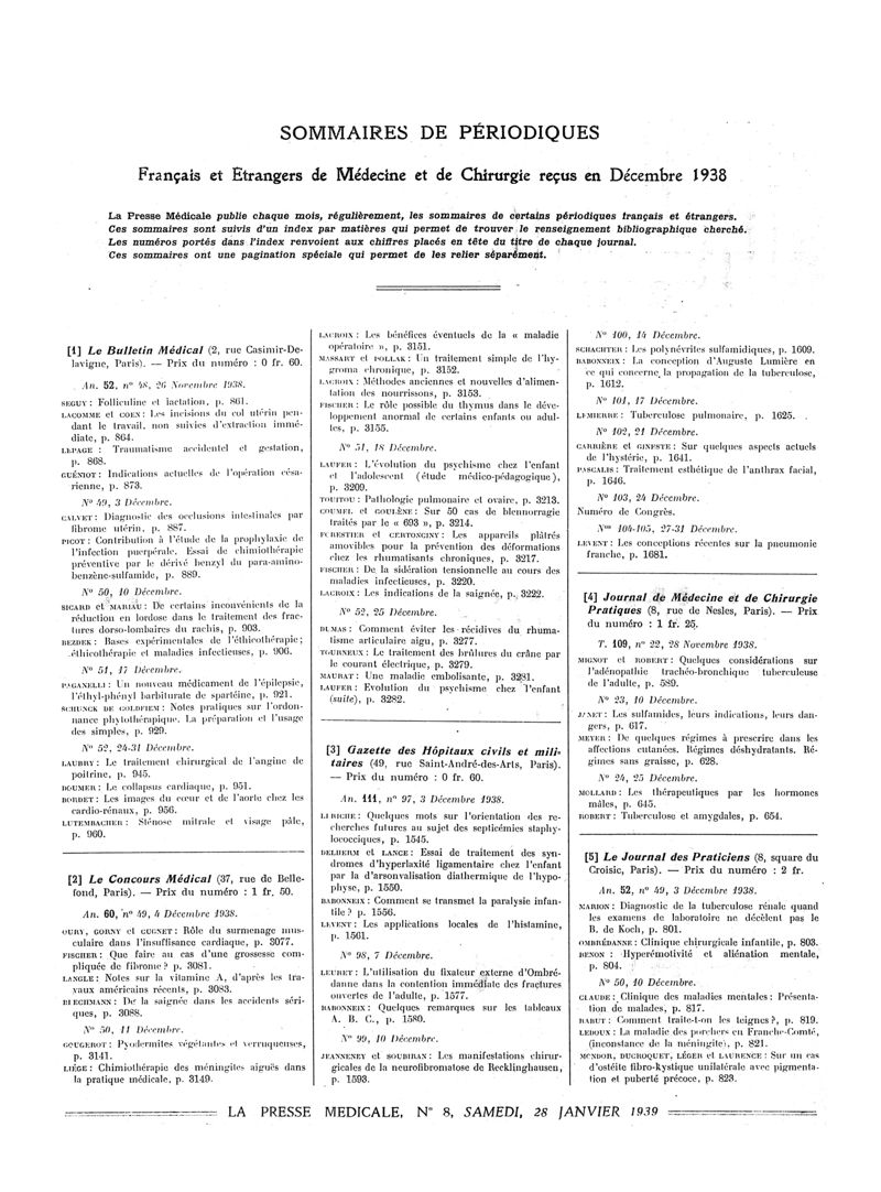1939, Sommaires des périodiques. -