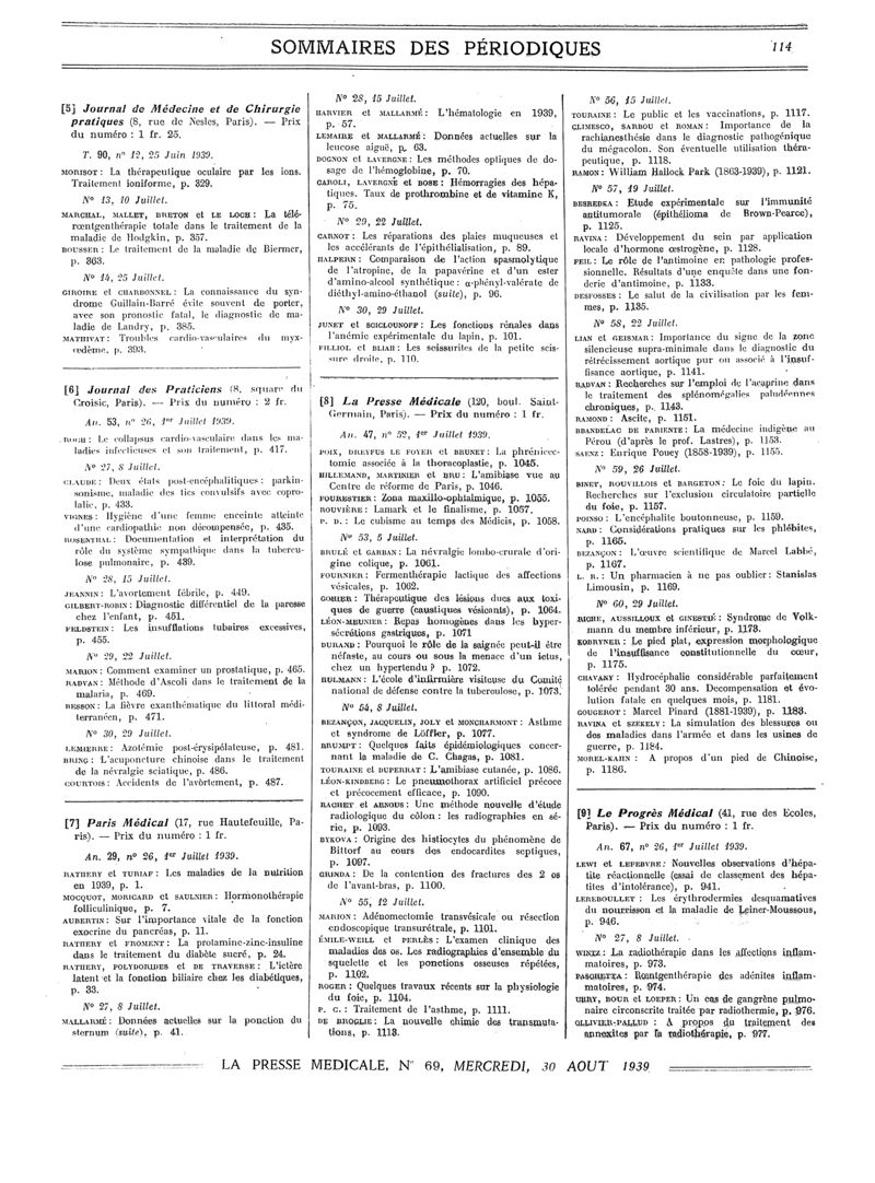 1939, Sommaires des périodiques. -