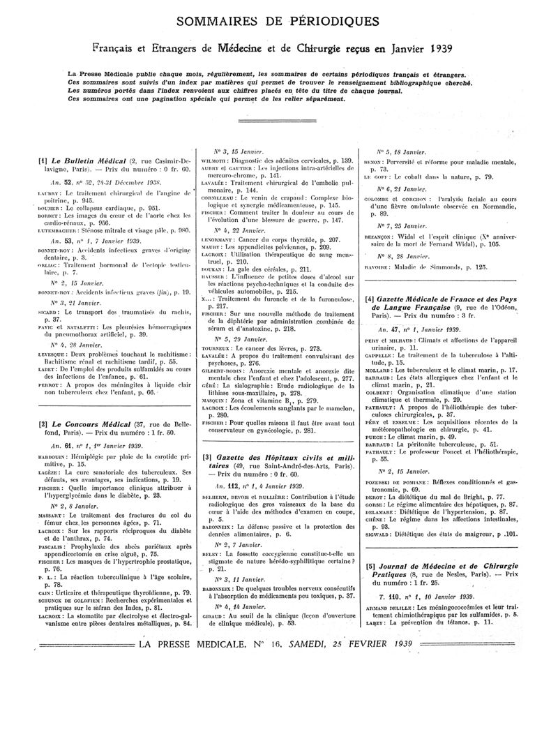 1939, Sommaires des périodiques. -