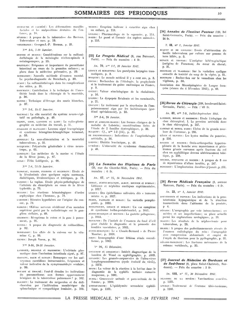 1942, Sommaires des périodiques. -