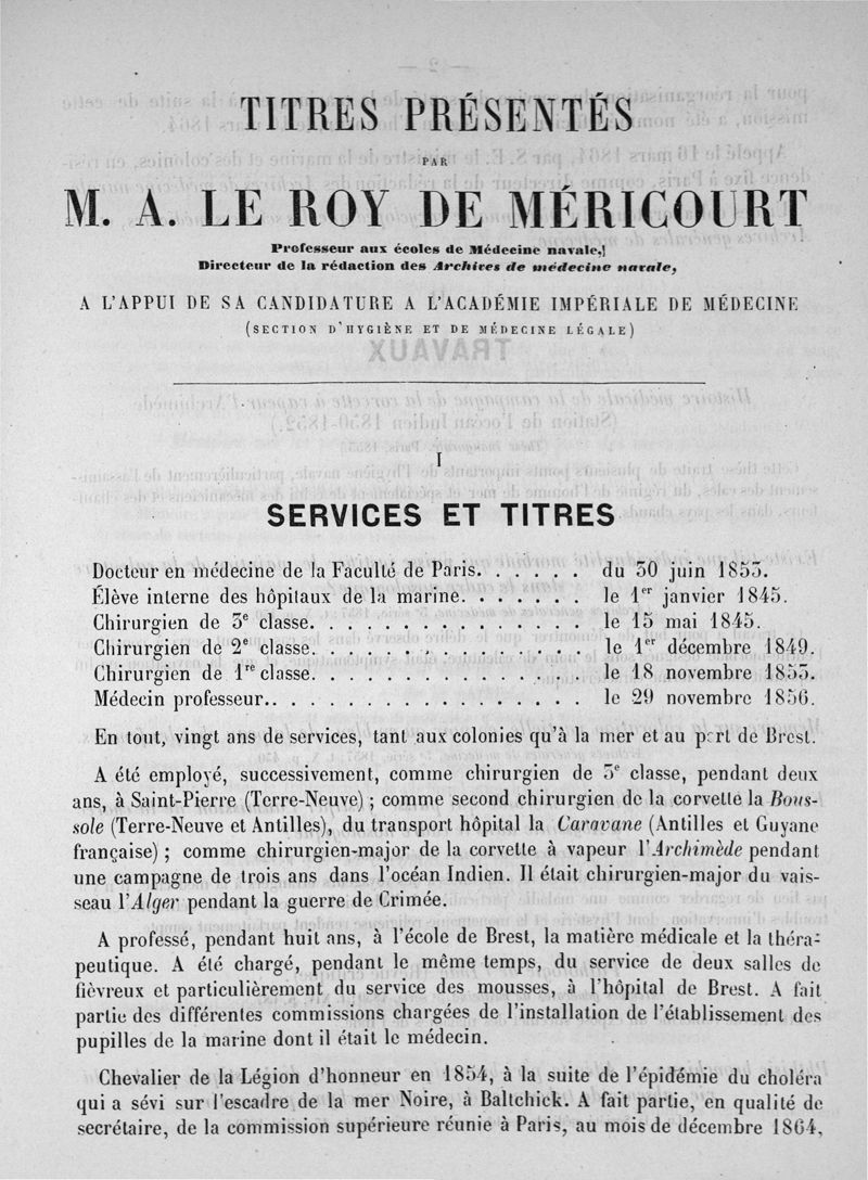 Titres présentés par A. Le Roy de Méricourt...à l'appui de sa candidature à l'Académie impériale de médecine, section d'hygiène et de médecine légale