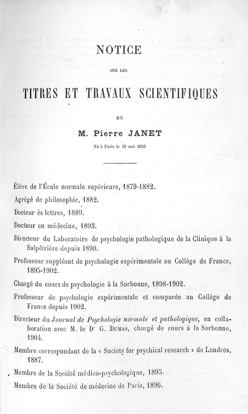 Notice sur les titres et travaux scientifiques de M. Pierre Janet,...candidat à l'Académie de médecine, section des membres associés libres