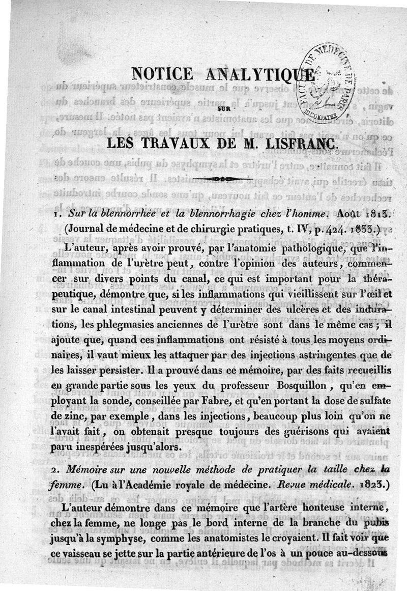 Notice analytique sur les travaux de Lisfranc