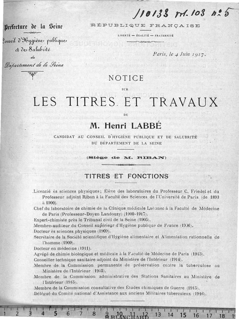 Notice sur les titres et travaux de M. Henri Labbé, candidat au Conseil d'Hygiène publique et de salubrité du département de la Seine, siège de M. Riban