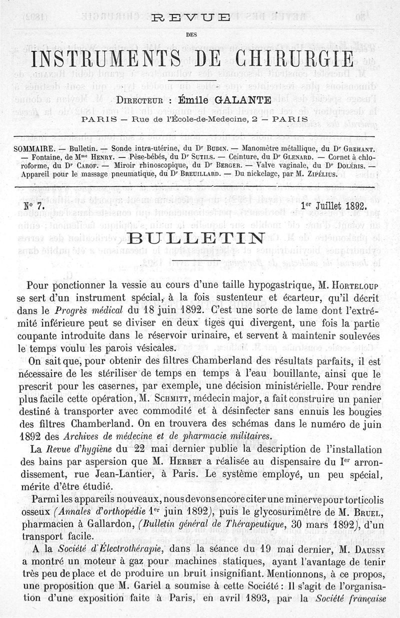 Revue des instruments de chirurgie ; bulletin mensuel illustré des instruments et appareils en usage dans les sciences médicales ; dir. Emile Galante
