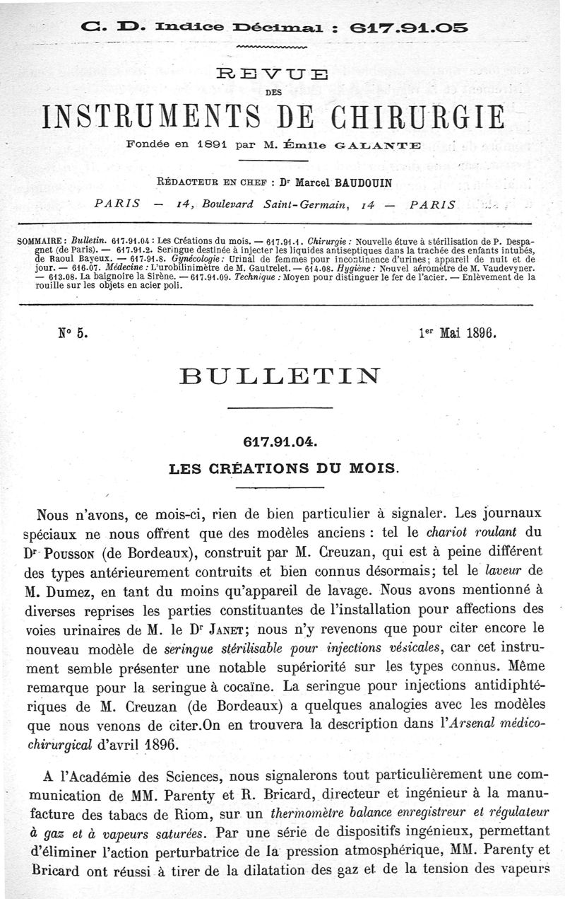 Revue des instruments de chirurgie ; bulletin mensuel illustré des instruments et appareils en usage dans les sciences médicales ; dir. Emile Galante