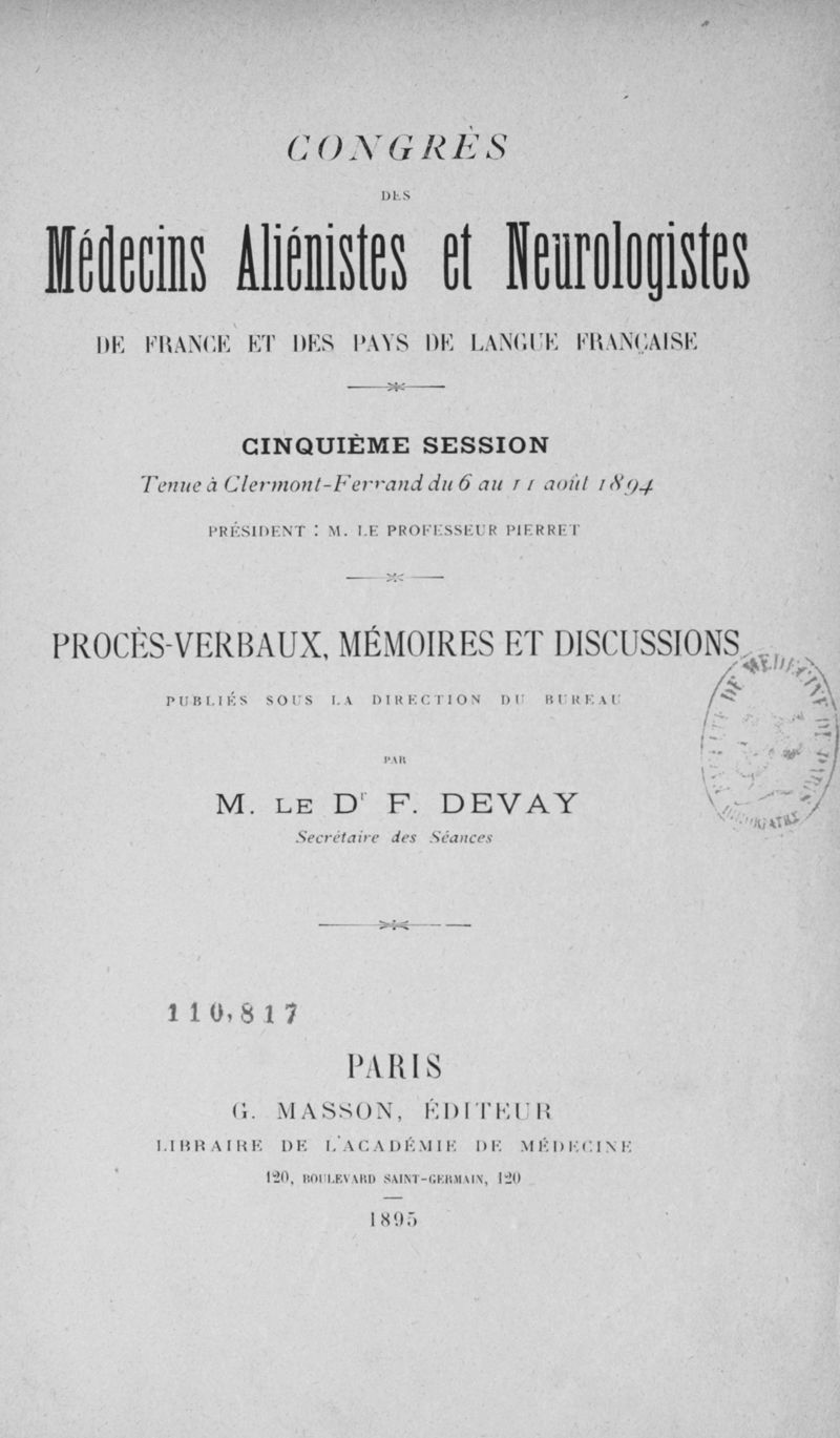 Congrès des médecins aliénistes et neurologistes de France et des pays de langue française : cinquième session tenue à Clermont-Ferrand du 6 au 11 août 1894