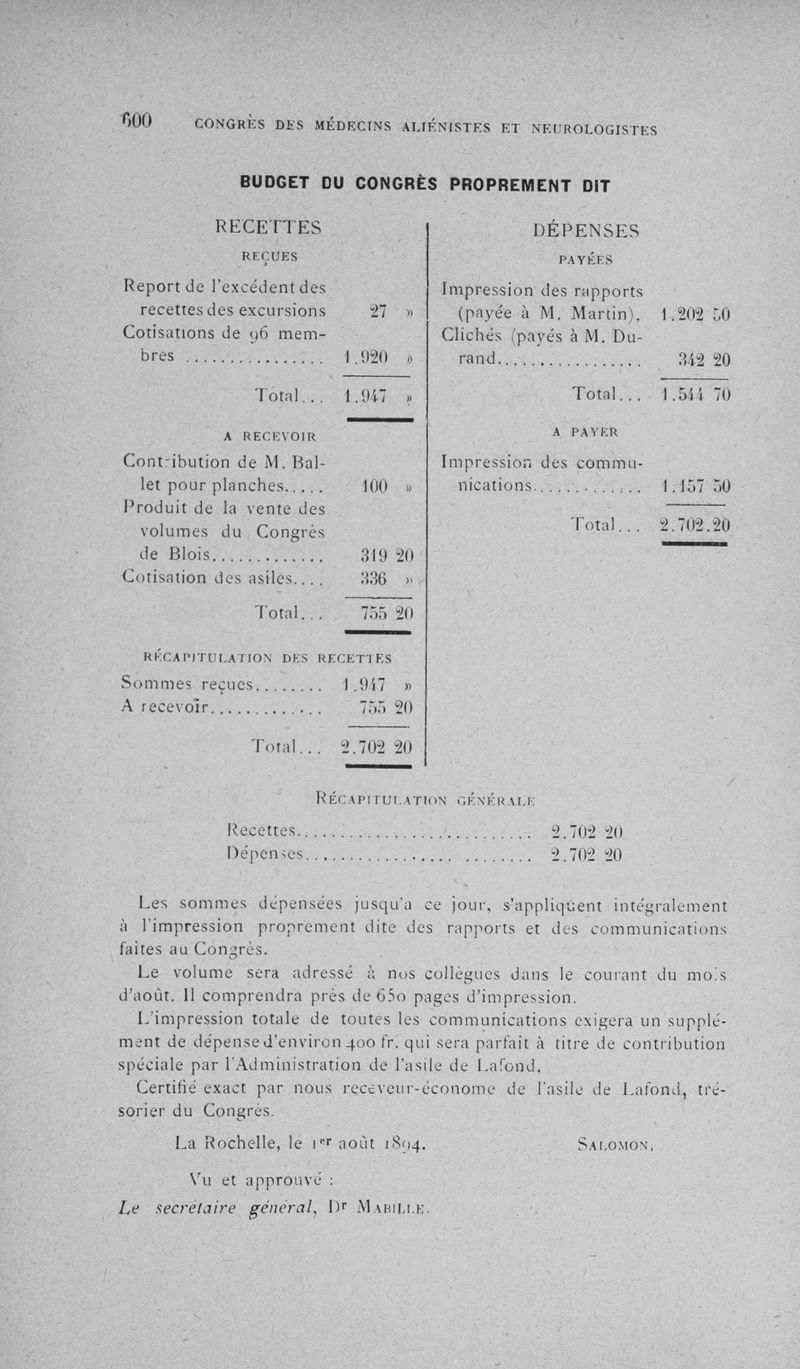 Congrès des médecins aliénistes et neurologistes de France et des pays de langue française : cinquième session tenue à Clermont-Ferrand du 6 au 11 août 1894