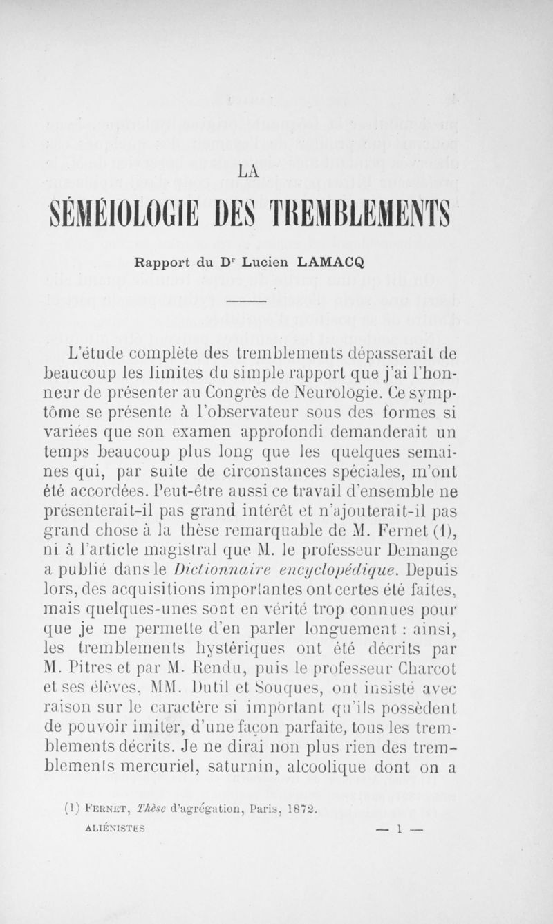 Congrès des médecins aliénistes et neurologistes de France et des pays de langue française : septième session tenue à Nancy du 1er au 5 août 1896. Volume I : Rapports