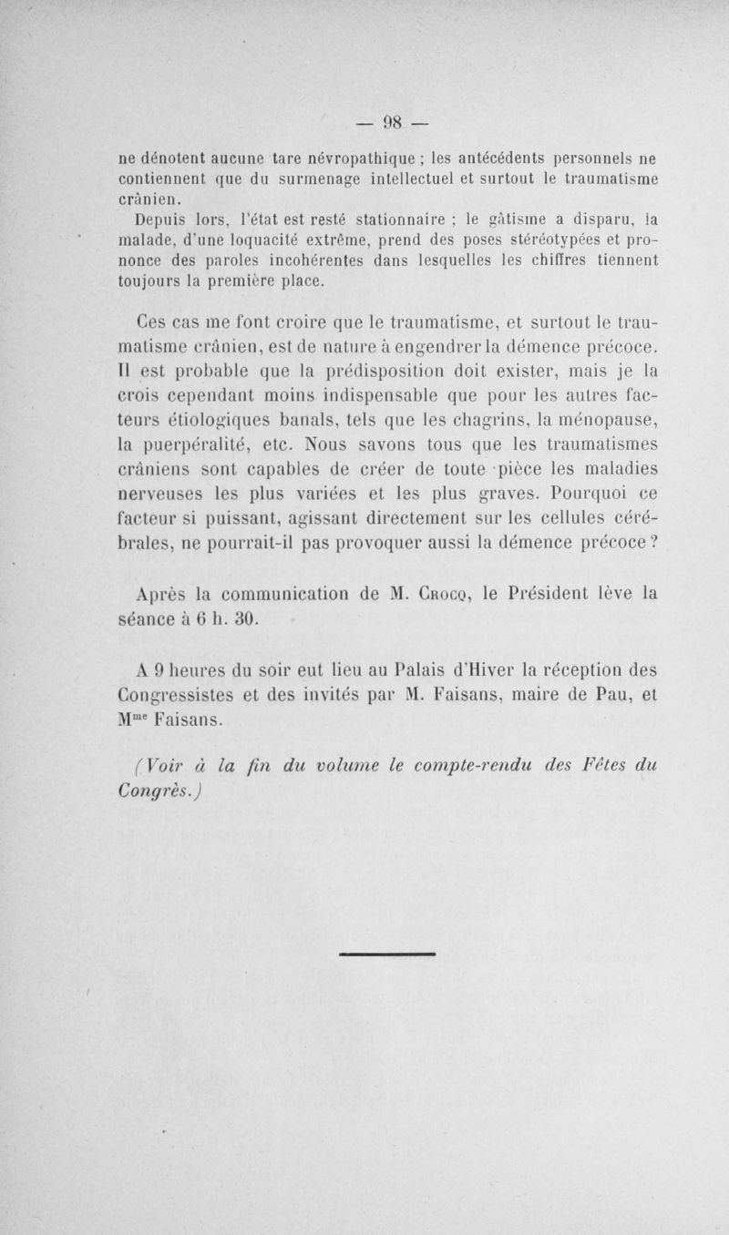 Congrès des médecins aliénistes et neurologistes de France et des pays de langue française : XIV° session, tenue à Pau du 1er au 7 août 1904. Volume II : Comptes rendus