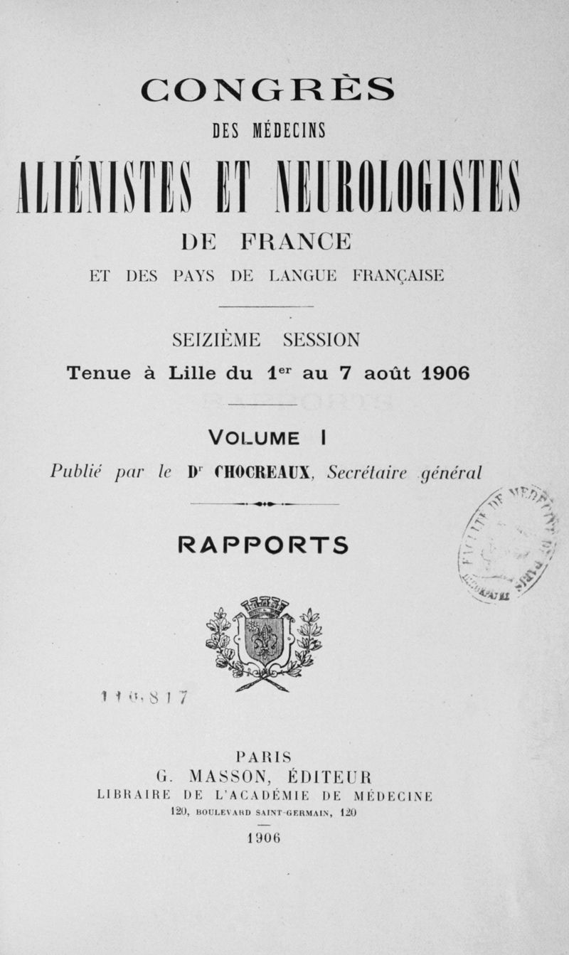 Congrès des médecins aliénistes et neurologistes de France et des pays de langue française : seizième session, tenue à Lille du 1er au 7 août 1906. Volume I : Rapports
