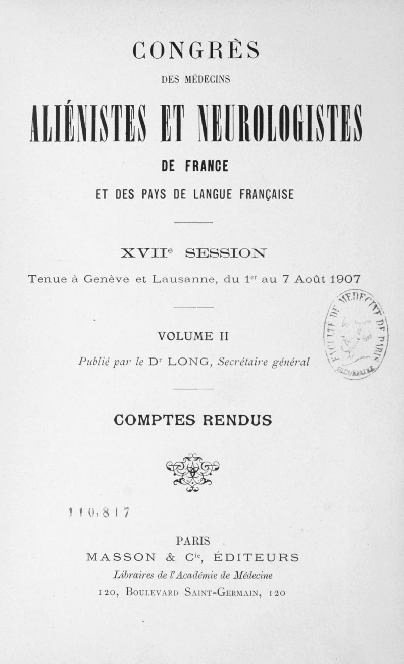 Congrès des médecins aliénistes et neurologistes de France et des pays de langue française : XVII° session tenue à Genève et Lausanne, du 1er au 7 août 1907. Volume II : Comptes rendus
