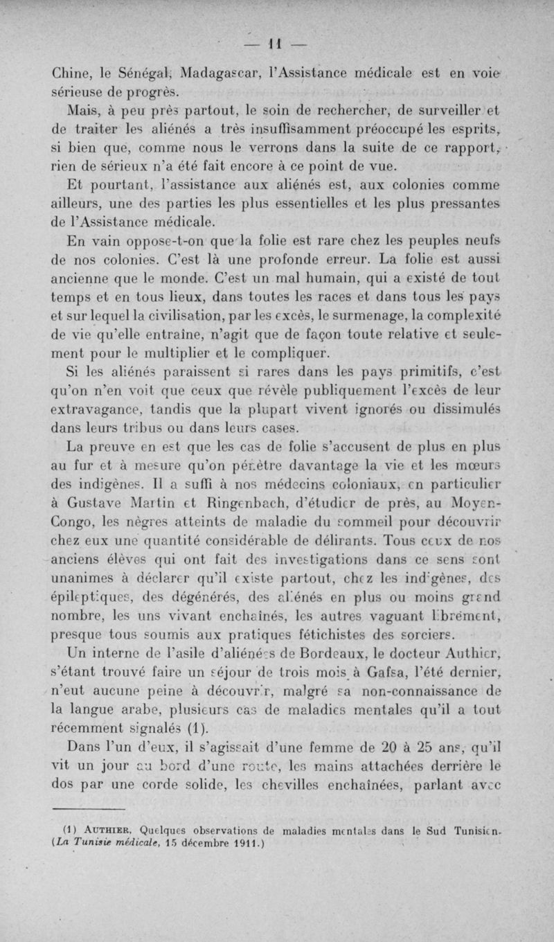 L'assistance des aliénés aux colonies