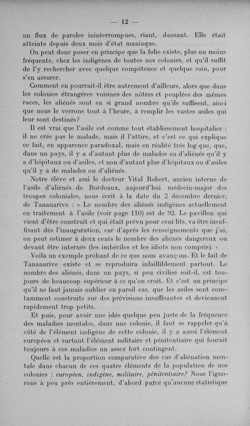 L'assistance des aliénés aux colonies