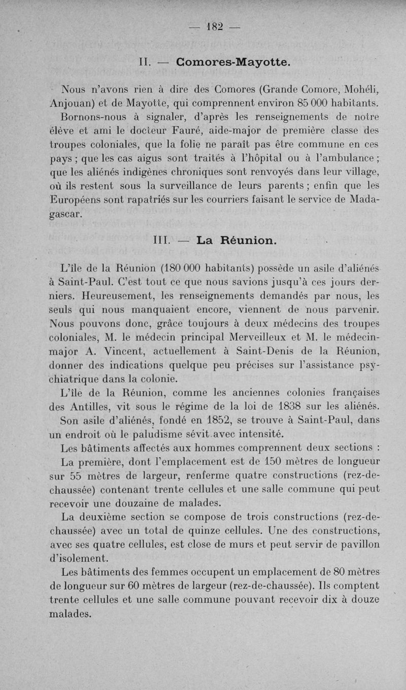L'assistance des aliénés aux colonies