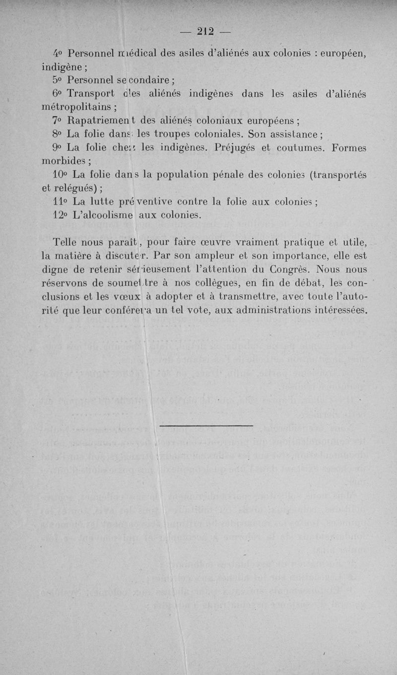 L'assistance des aliénés aux colonies