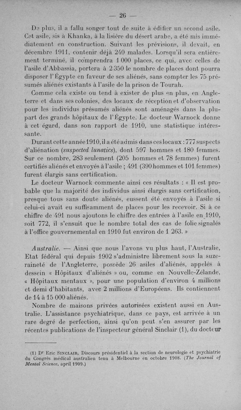 L'assistance des aliénés aux colonies