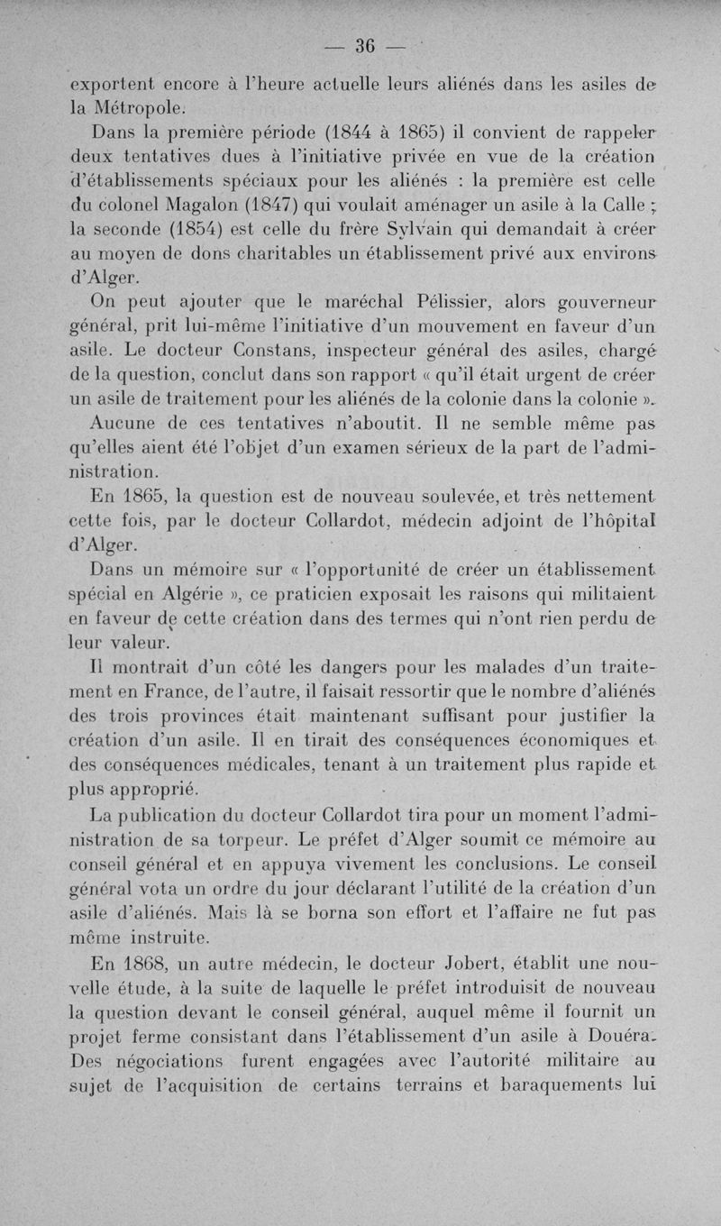 L'assistance des aliénés aux colonies
