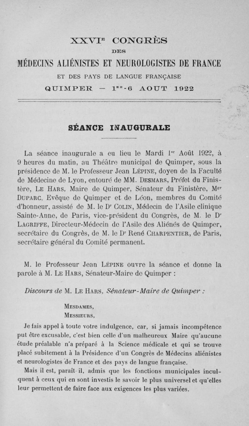 XXVI° congrès des médecins aliénistes et neurologistes de France et des pays de langue française. Quimper - 1er-6 août 1922. Discussion des rapports, communications, comptes rendus