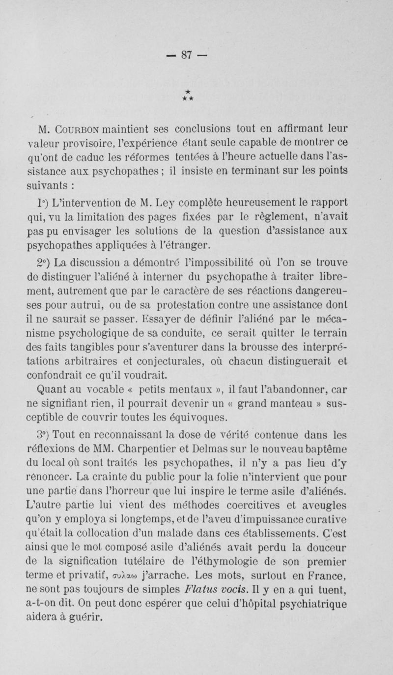 XXVI° congrès des médecins aliénistes et neurologistes de France et des pays de langue française. Quimper - 1er-6 août 1922. Discussion des rapports, communications, comptes rendus