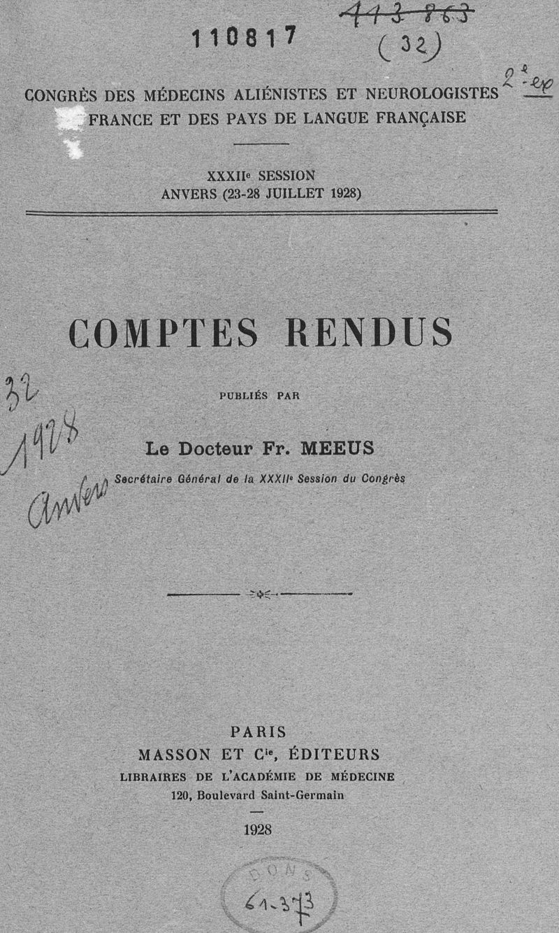 Congrès des médecins aliénistes et neurologistes de France et des pays de langue française. XXXII° session, Anvers (23-28 juillet 1928). Comptes rendus
