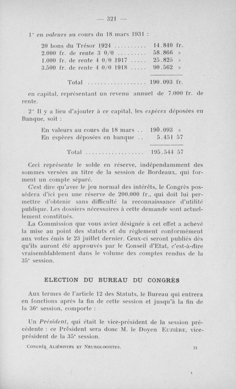 Congrès des médecins aliénistes et neurologistes de France et des pays de langue française. XXXV° session. Bordeaux (7-12 avril 1931). Comptes rendus
