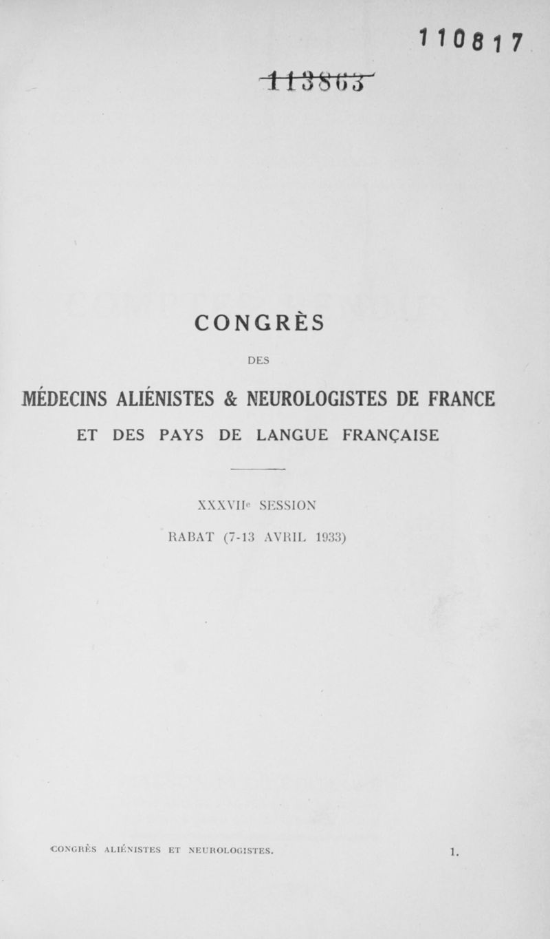 Congrès des médecins aliénistes et neurologistes de France et des pays de langue française. XXXV° session. Rabat (7-13 avril 1933). Comptes rendus