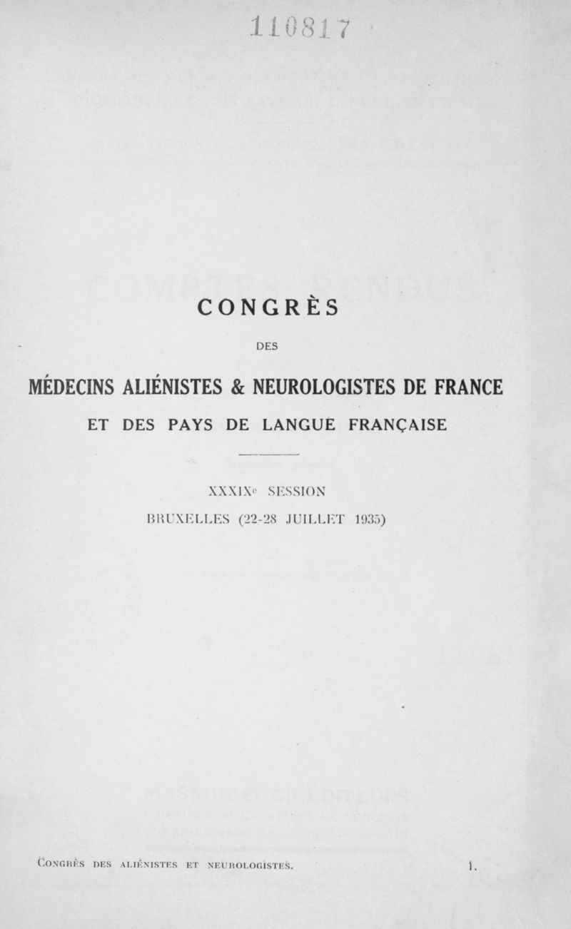 Congrès des médecins aliénistes et neurologistes de France et des pays de langue française. XXXV° session. Bruxelles (22-28 juillet 1935). Comptes rendus