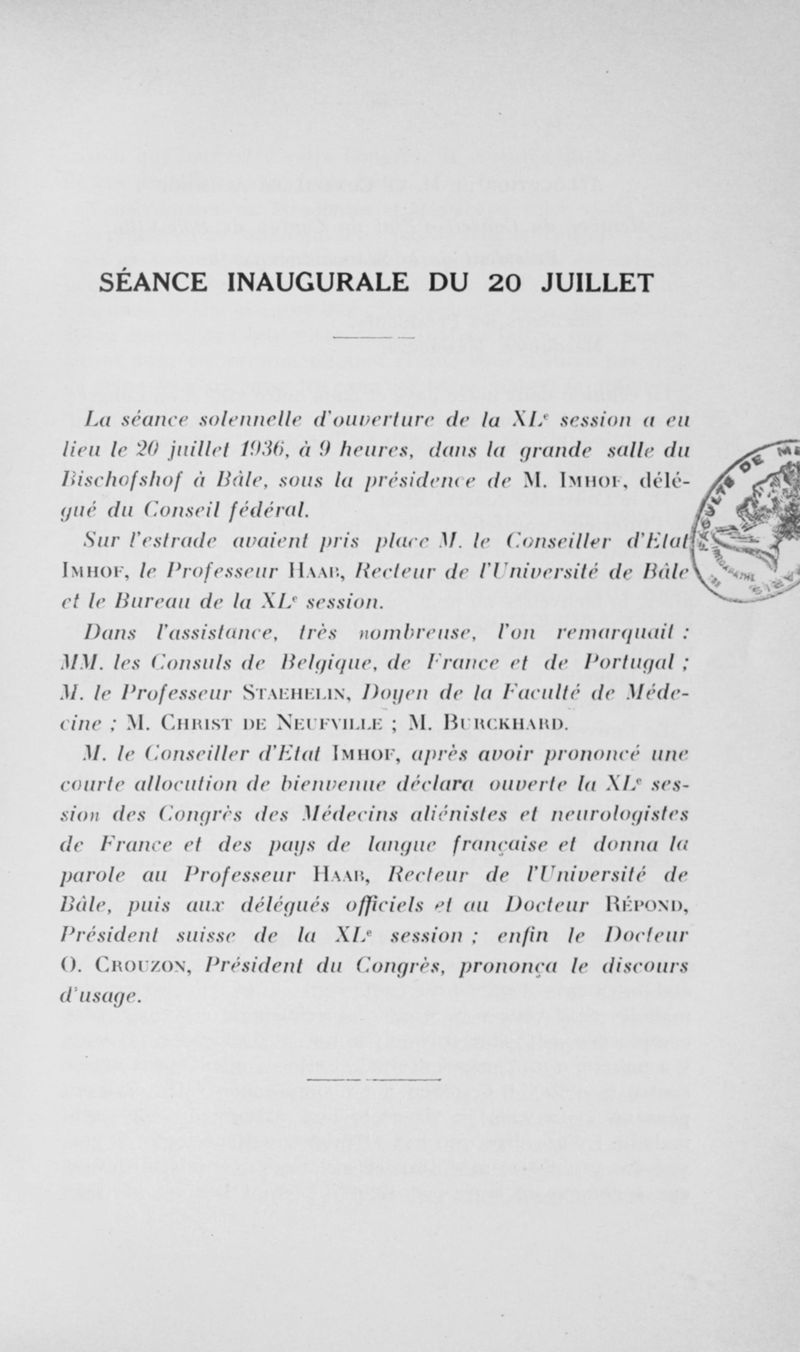 Congrès des médecins aliénistes et neurologistes de France et des pays de langue française. XXXV° session. Bâle-Zurich-Berne-Neuchätel (20-25 juillet 1936). Comptes rendus