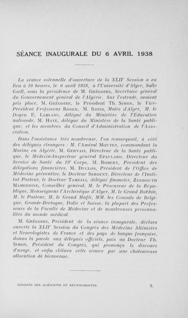 Congrès des médecins aliénistes et neurologistes de France et des pays de langue française. XXXV° session. Alger (6-11 avril 1938). Comptes rendus