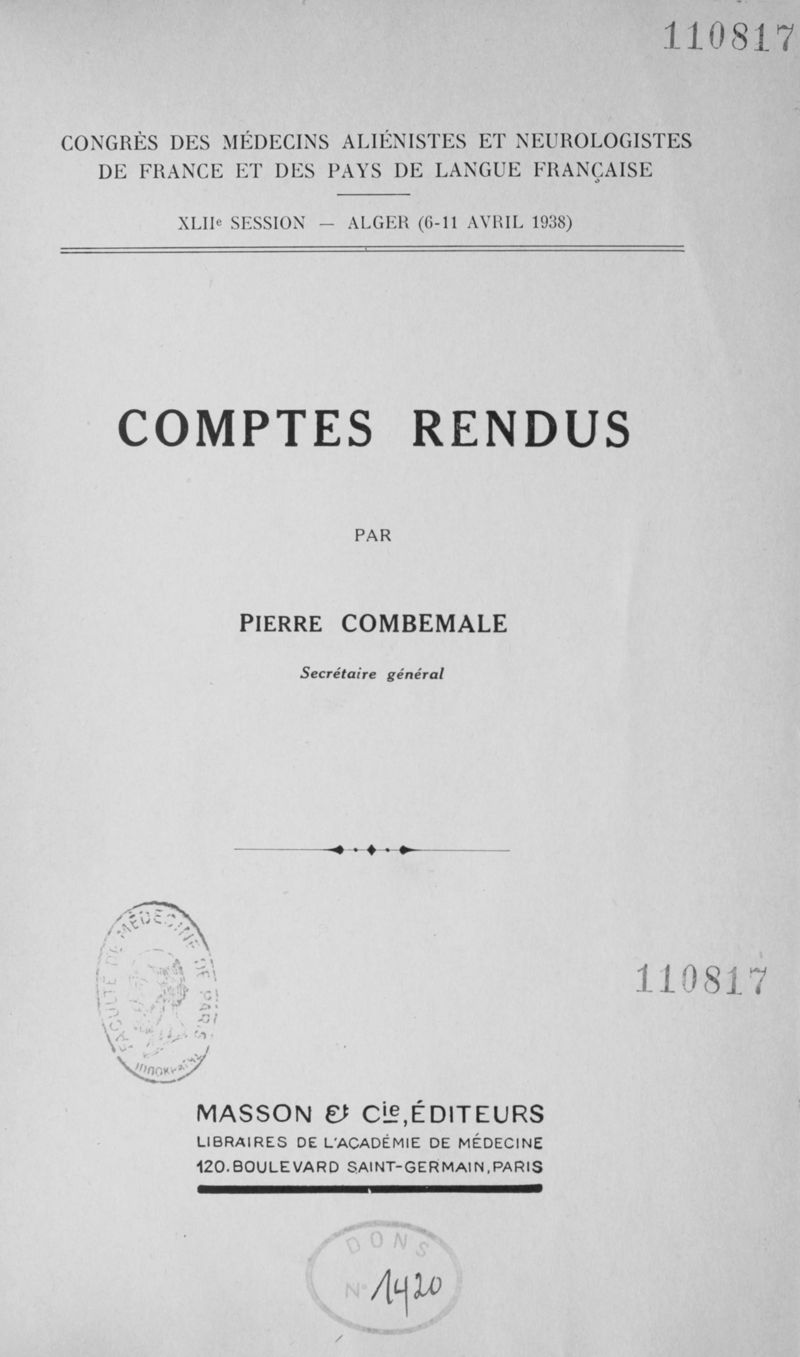 Congrès des médecins aliénistes et neurologistes de France et des pays de langue française. XXXV° session. Alger (6-11 avril 1938). Comptes rendus