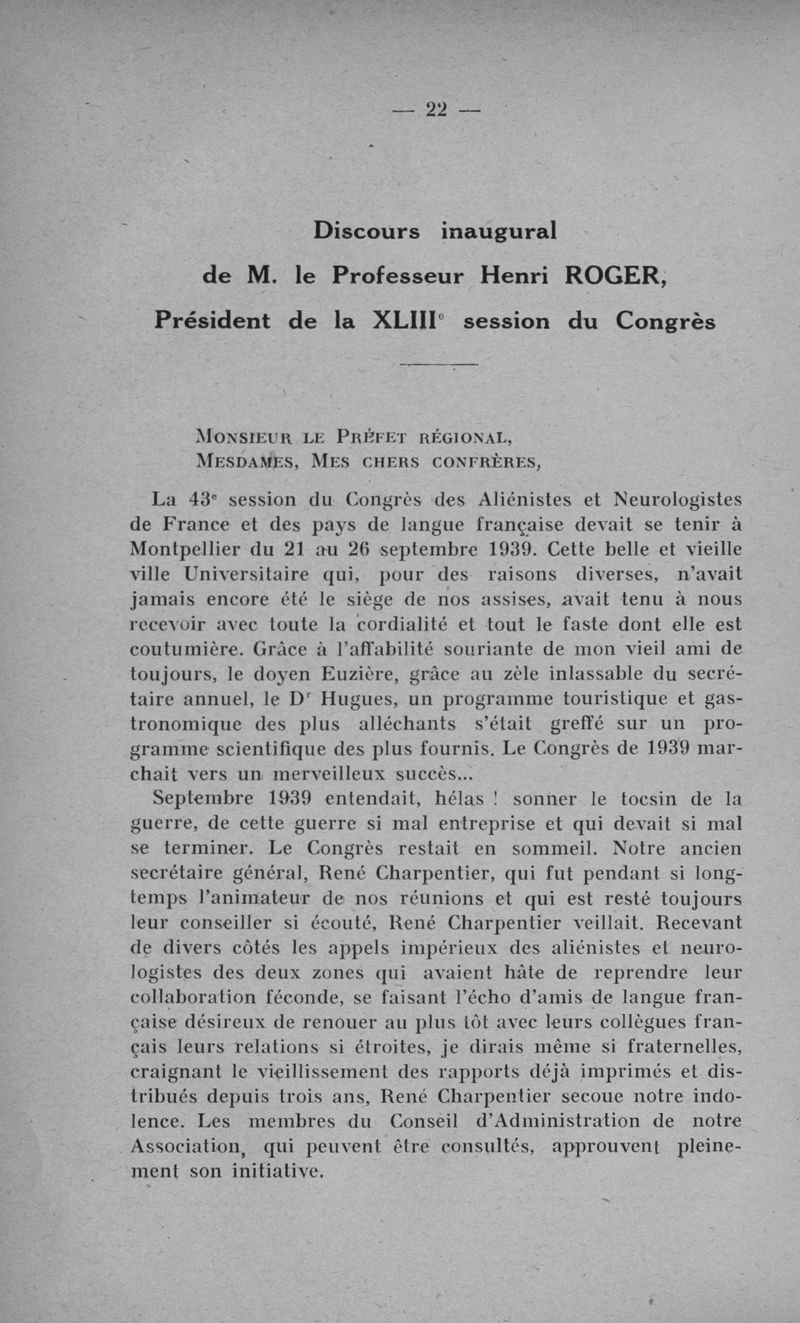 Congrès des médecins aliénistes et neurologistes de France et des pays de langue française. XLIII° session. Montpellier (28, 29, 30 octobre 1942). Comptes rendus