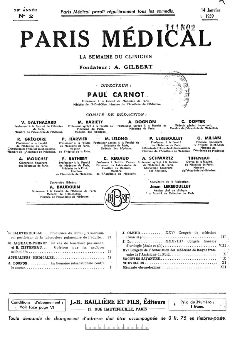 1939, n° 111, partie médicale. -