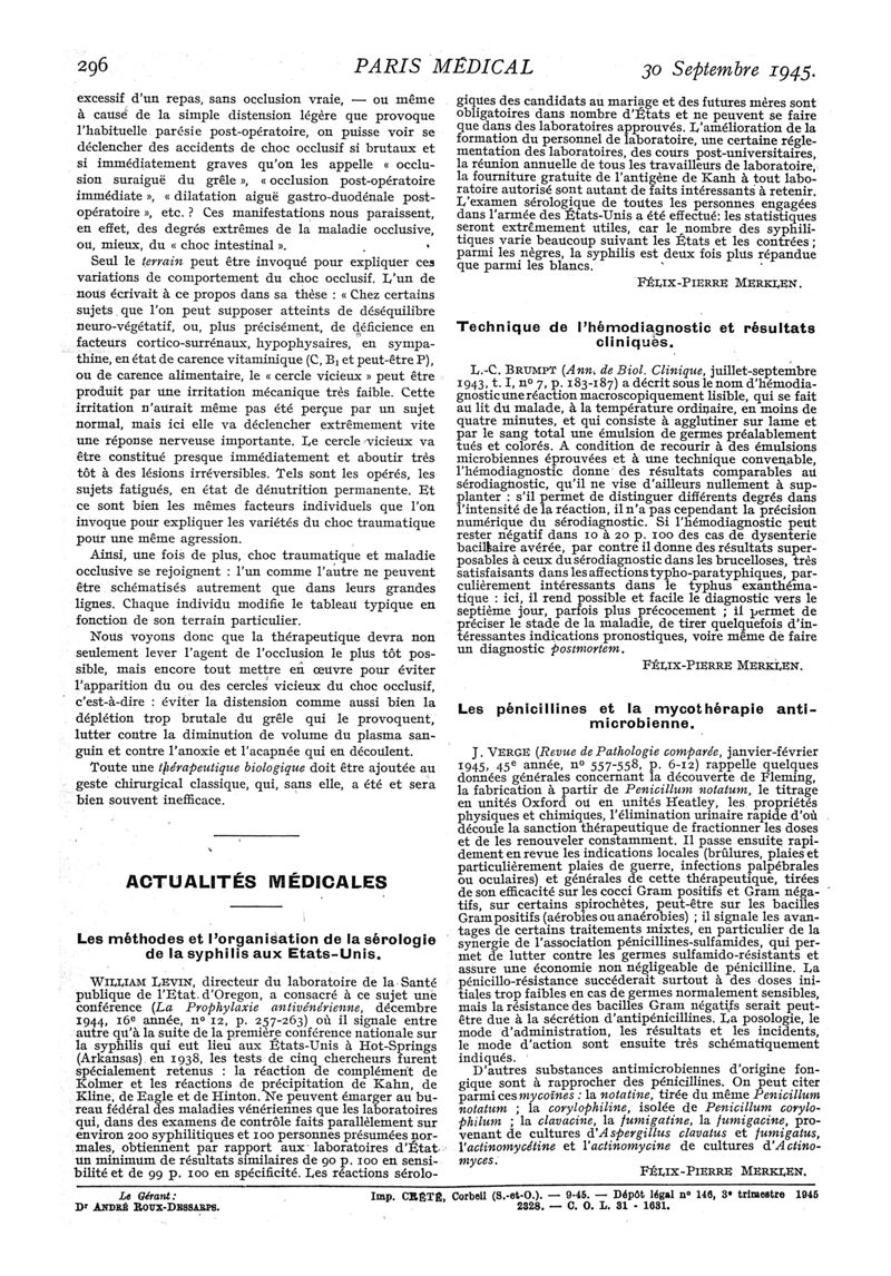 1945, n° 129, partie médicale. -