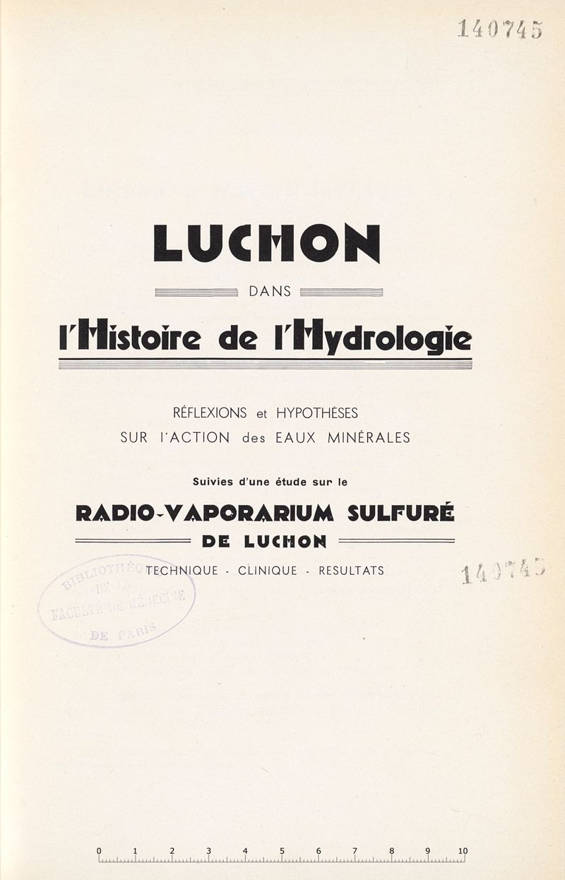 Luchon dans l'histoire de l'hydrologie : réflexions et hypothèses sur l'action des eaux minérales ; suivies d'une Étude sur le radio-vaporarium sulfuré de Luchon : technique, clinique, résultats