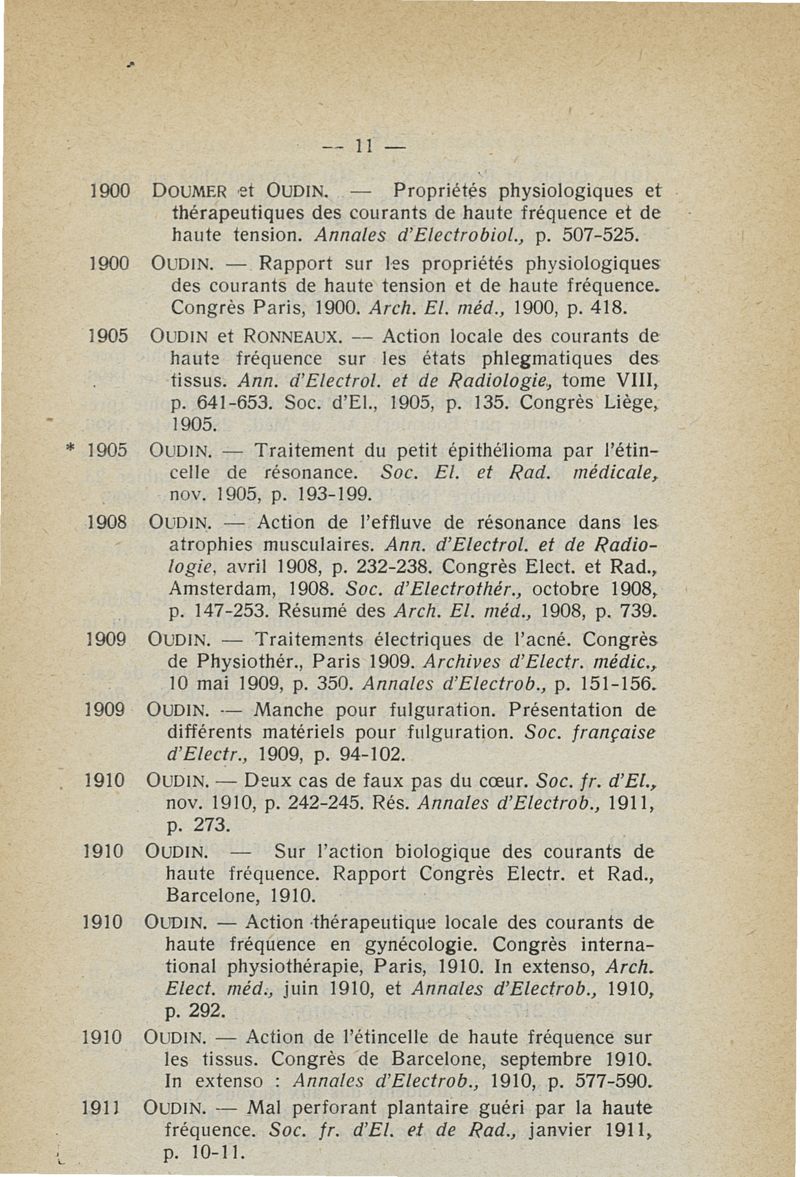 L'oeuvre scientifique du docteur P. Oudin (1851-1923). La Société française d'Electrothérapie et de Radiologie médicale en hommage à son ancien Président