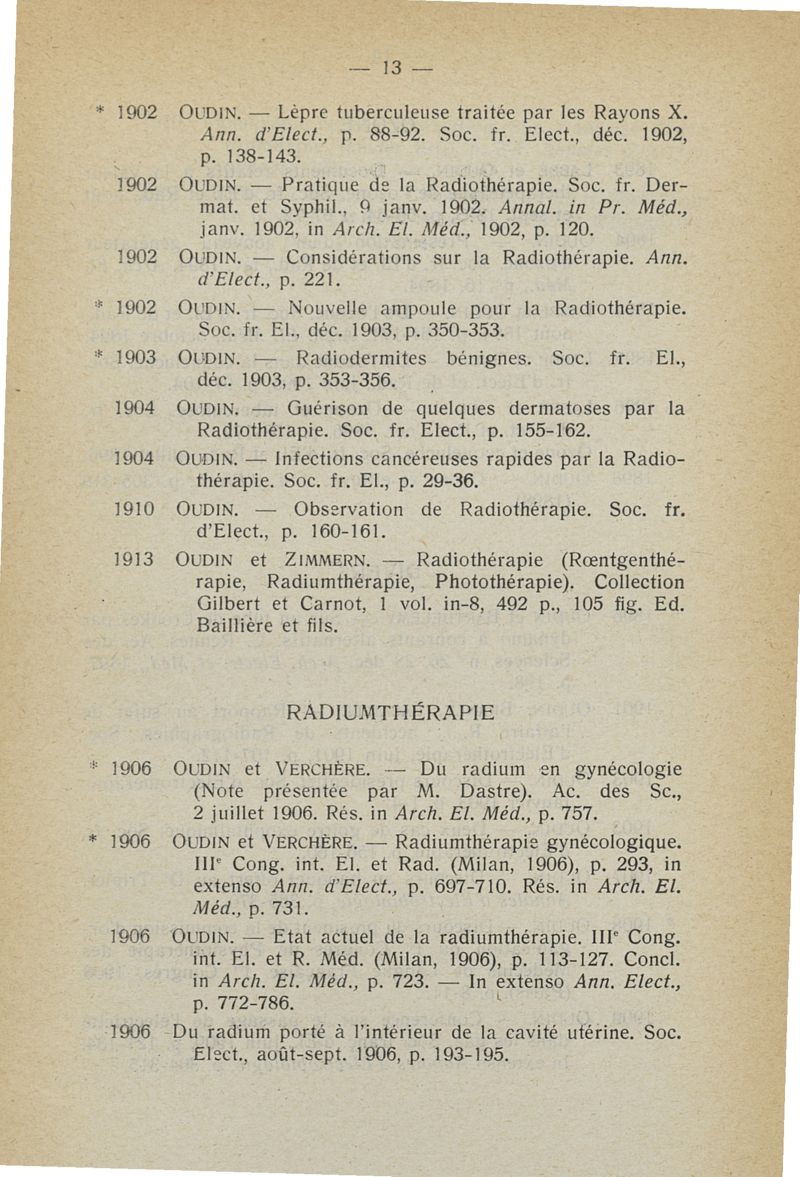 L'oeuvre scientifique du docteur P. Oudin (1851-1923). La Société française d'Electrothérapie et de Radiologie médicale en hommage à son ancien Président