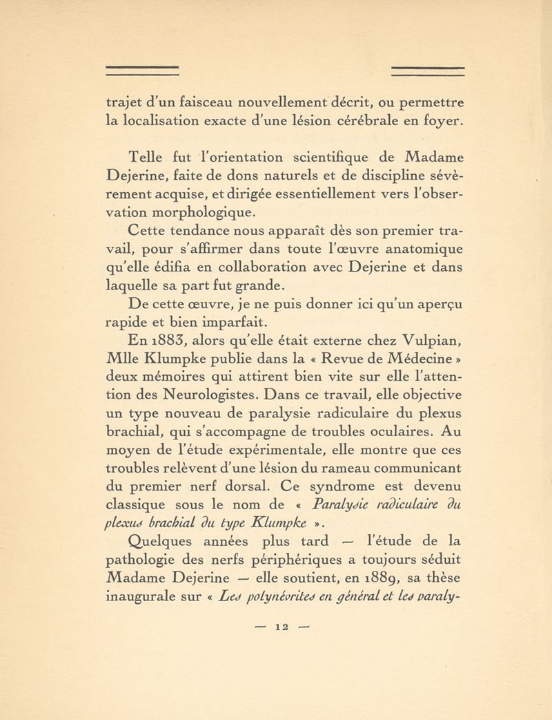 Éloge de Madame Déjerine-Klumpke (1859-1927). Discours prononcé à la séance du 1er décembre 1927 de la Société de neurologie de Paris