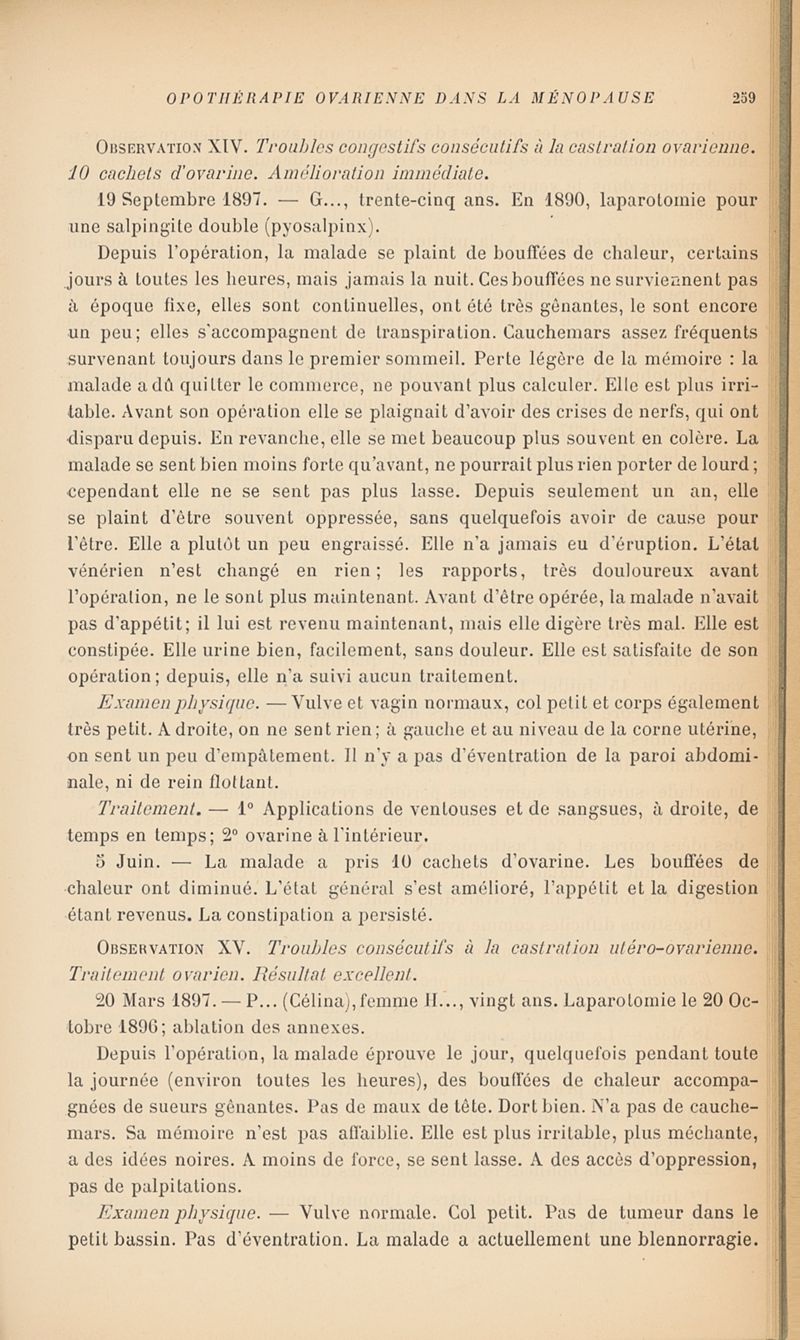 Opothérapie ovarienne dans la ménopause artificielle post-opératoire et la ménopause naturelle