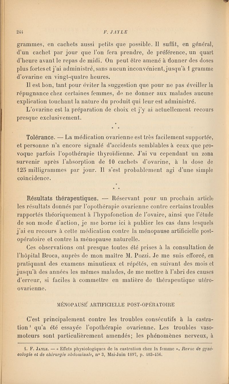 Opothérapie ovarienne dans la ménopause artificielle post-opératoire et la ménopause naturelle