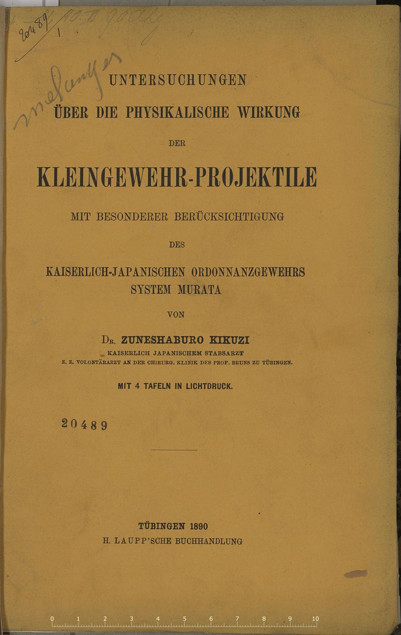Untersuchungen über die physikalische Wirkung der Kleingewehr-Projektile, mit besonderer Berücksichtigung des kaiserlich-japanischen Ordonnazgewehrs, System Murata -- von Dr. Zuneshaburo Kikuzi