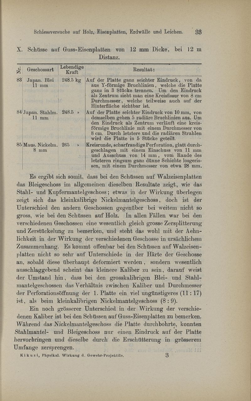 Untersuchungen über die physikalische Wirkung der Kleingewehr-Projektile, mit besonderer Berücksichtigung des kaiserlich-japanischen Ordonnazgewehrs, System Murata -- von Dr. Zuneshaburo Kikuzi