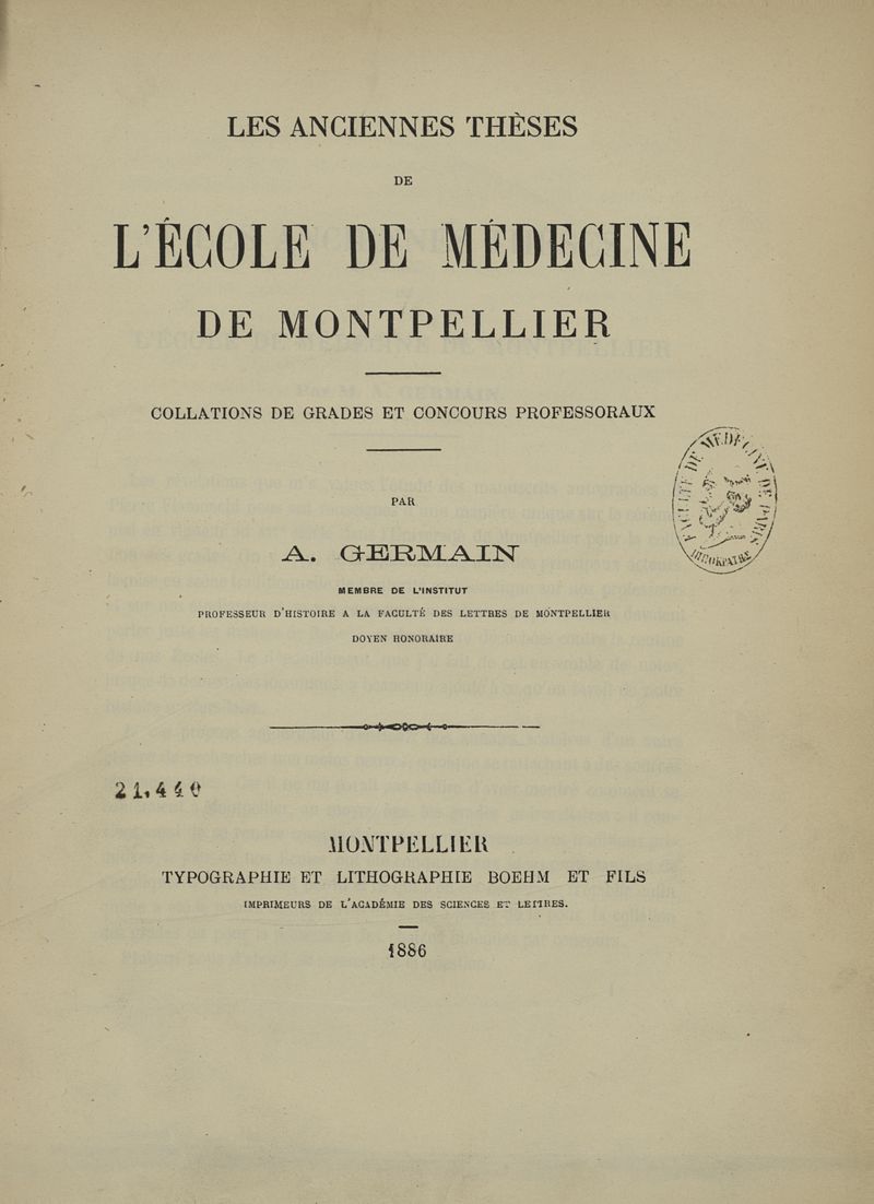 Montpellier : Typographie et lithographie Boehm et fils, 1886.