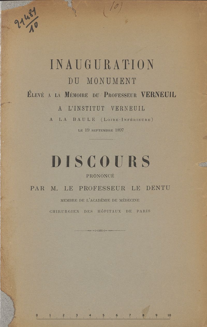 Inauguration du monument élevé à la mémoire du professeur Verneuil à l'Institut Verneuil à La Baule (Loire Inférieure) le 19 septembre 1897 - Discours prononcé par M. le Professeur Le Dentu