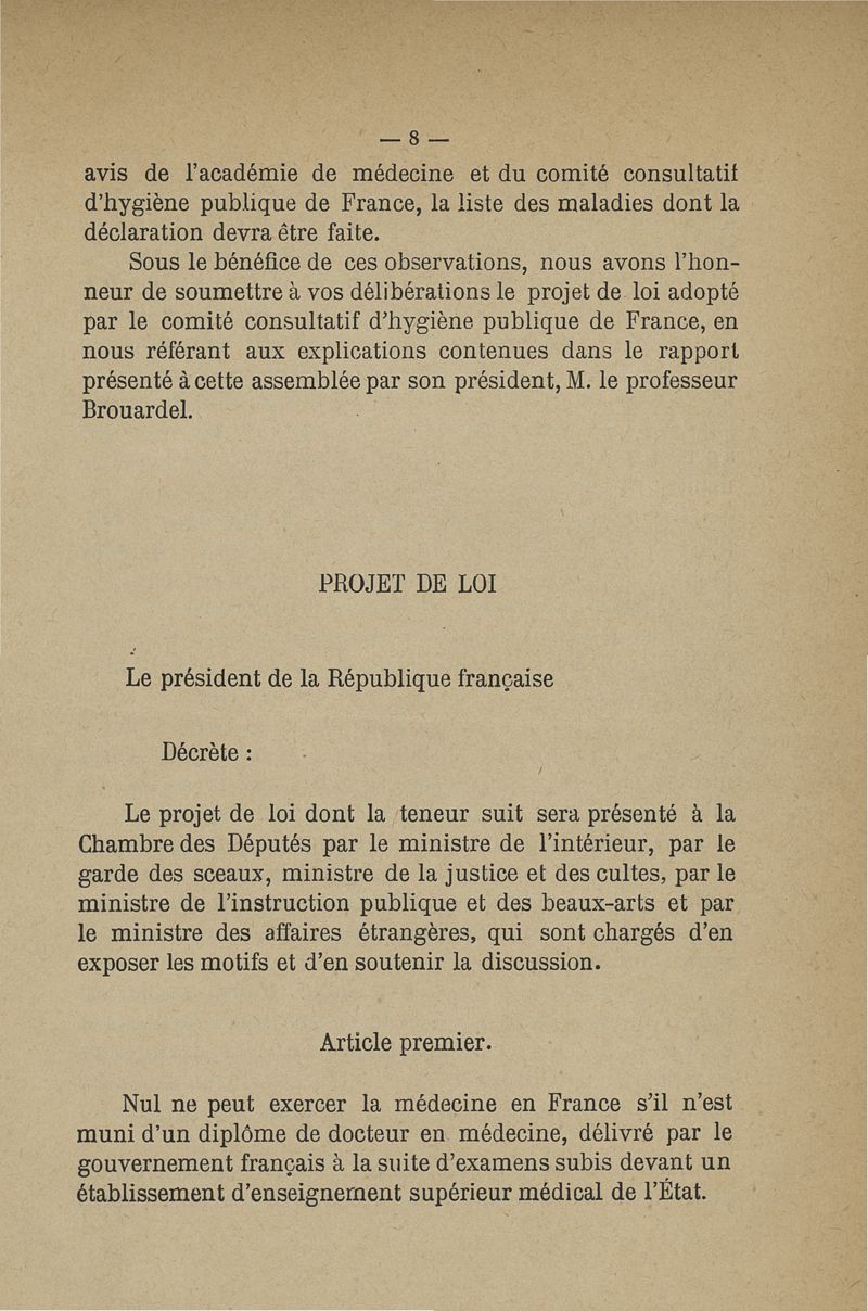 Projet de loi sur l'exercice de la médecine, présenté au nom de M. Carnot -- par M. Constans, M. Fallières, M. Léon Bourgeois, M. Ribot