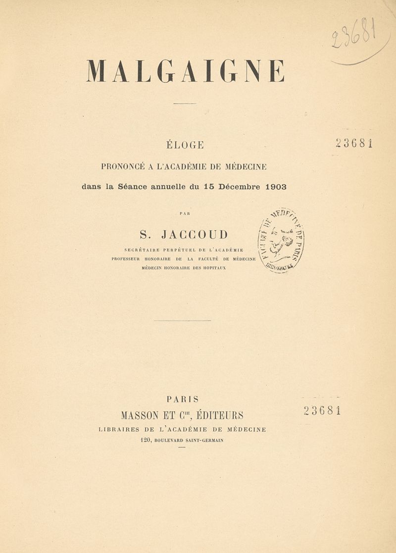Malgaigne - Eloge prononcé à l'Académie de médecine dans la Séance annuelle du 15 décembre 1903