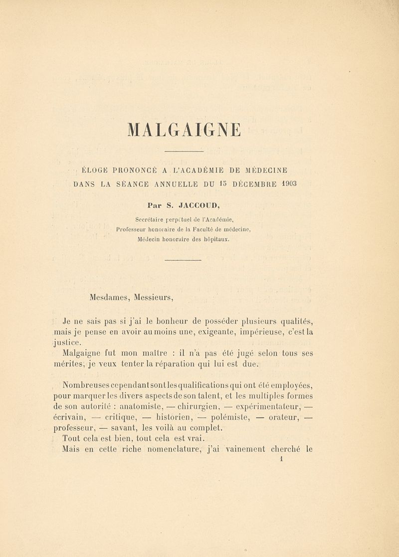 Malgaigne - Eloge prononcé à l'Académie de médecine dans la Séance annuelle du 15 décembre 1903