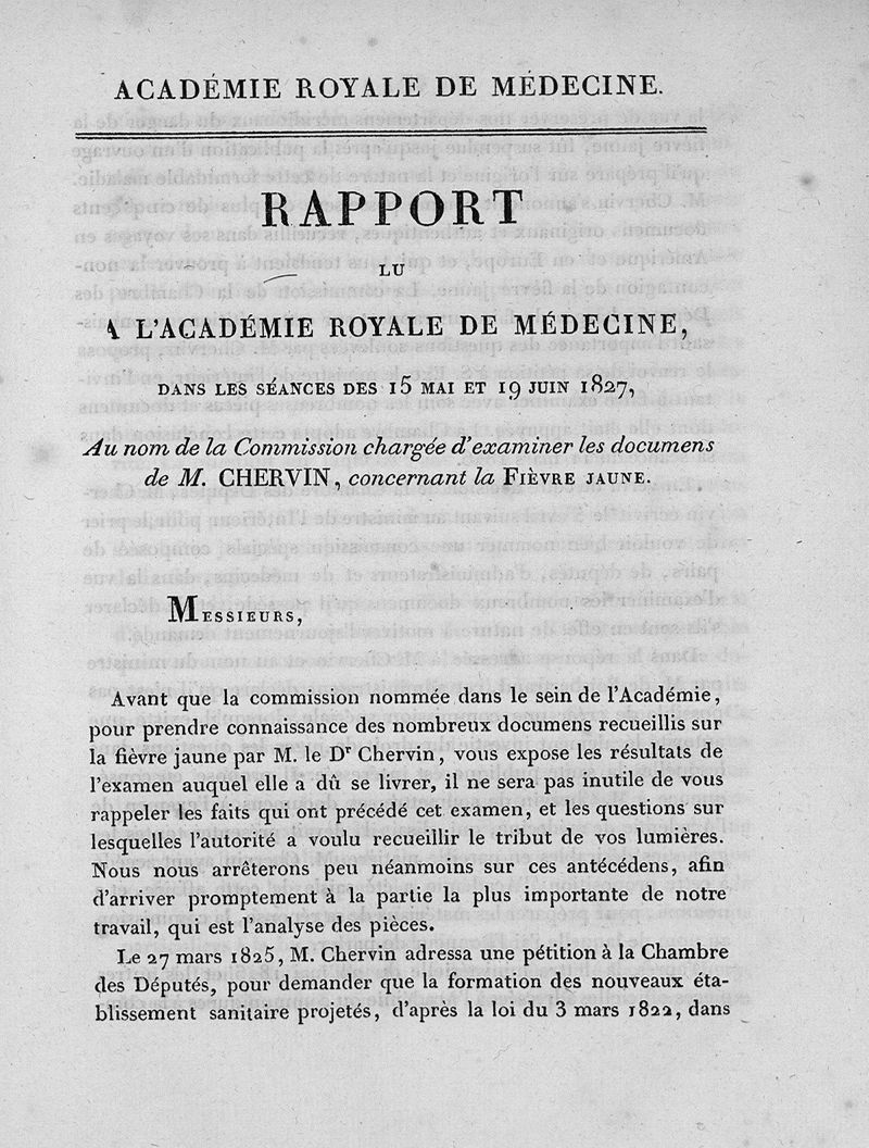 Rapport lu à l'Académie royale de médecine sur la fièvre jaune : dans les séances des 15 mai et 19 juin 1827 : au nom de la commission charhée d'examiner les documens de M. Chervin