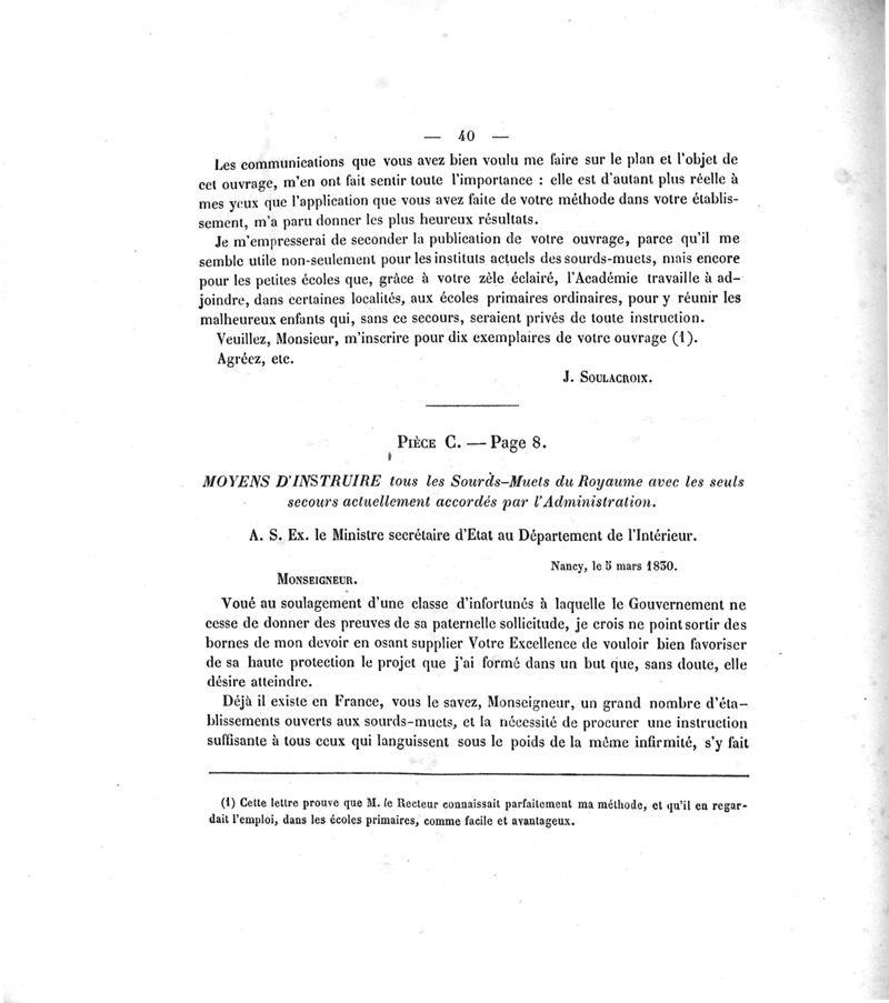 Mémoire sur les travaux de M. Piroux : pour faire commencer l'éducation et l'instruction des enfants sourds-muets dans les familles et dans les écoles primaires ; accompagné de pièces justificatives ou données nancéiennes pour la solution des questions soumises à MM. les recteurs d'Académie par le ministre de l'Instruction publique dans sa circulaire du 28 octobre 1863