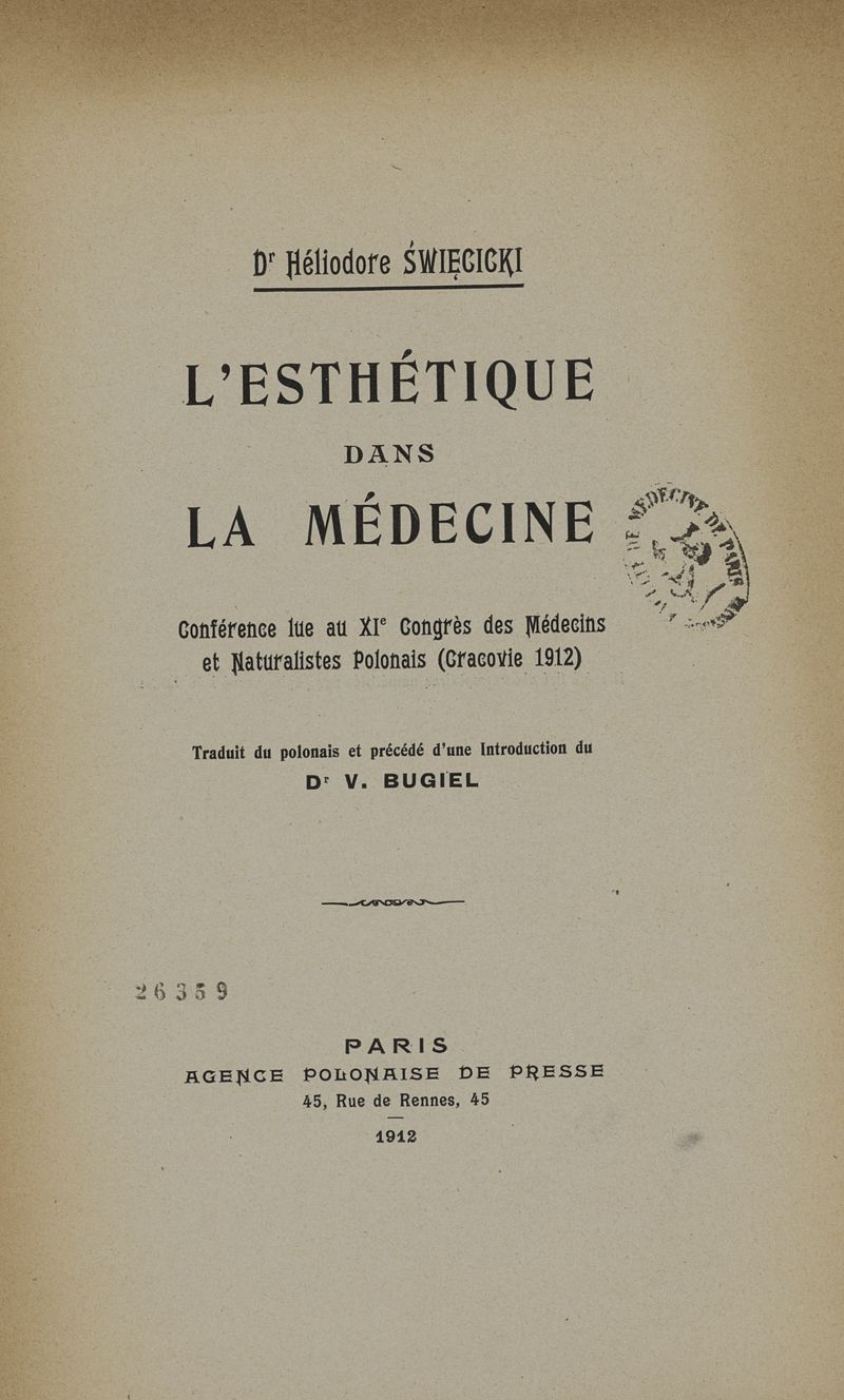 L'esthétique dans la médecine. Conférence lue au XIe Congrès des Médecins et Naturalistes Polonais (Cracovie 1912)